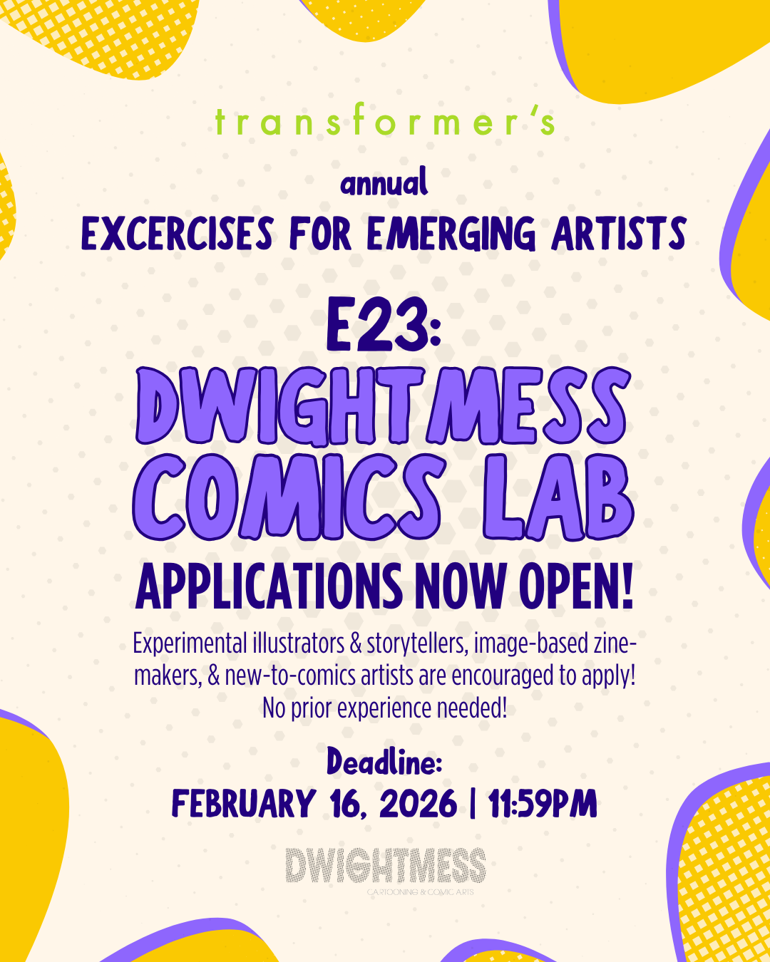 This year’s iteration of transformer’s Exercises for Emerging Artists will invite Comics Artists and Illustrators to participate in its peer critique & mentorship program. Led by DWIGHTMESS gallery director Adam Griffiths, four DC area based-artists will be selected to meet biweekly during the spring to develop artwork for a culminating summer exhibition at transformer in Washington DC. Guest lecturers, access to multipurpose spaces, borrowing privileges from an extensive comics and rare film collection, and intensives in screenprinting and risograph printing will be offered at DWIGHTMESS compound, located in Silver Spring, MD.